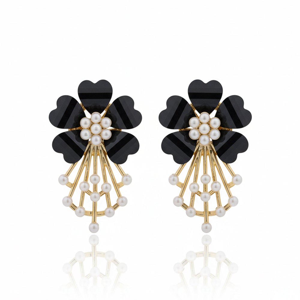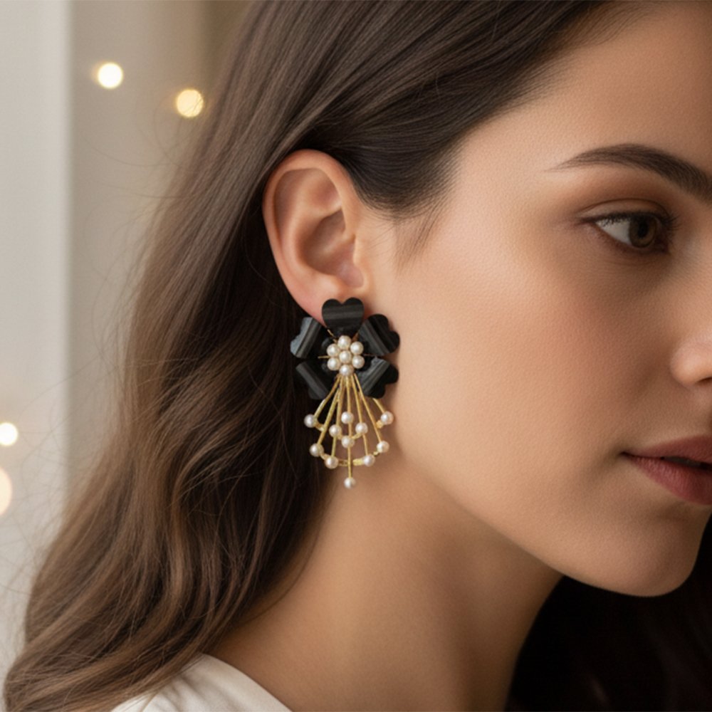 Make an unforgettable entrance with the Noir Bloom Statement Earrings. These highly dramatic pieces feature deep black heart-shaped petals forming a striking flower, centered with a luminous pearl cluster. The design finishes with a graceful, fan-like cascade of dangling pearls, creating a luxurious and sophisticated accessory perfect for high-fashion events