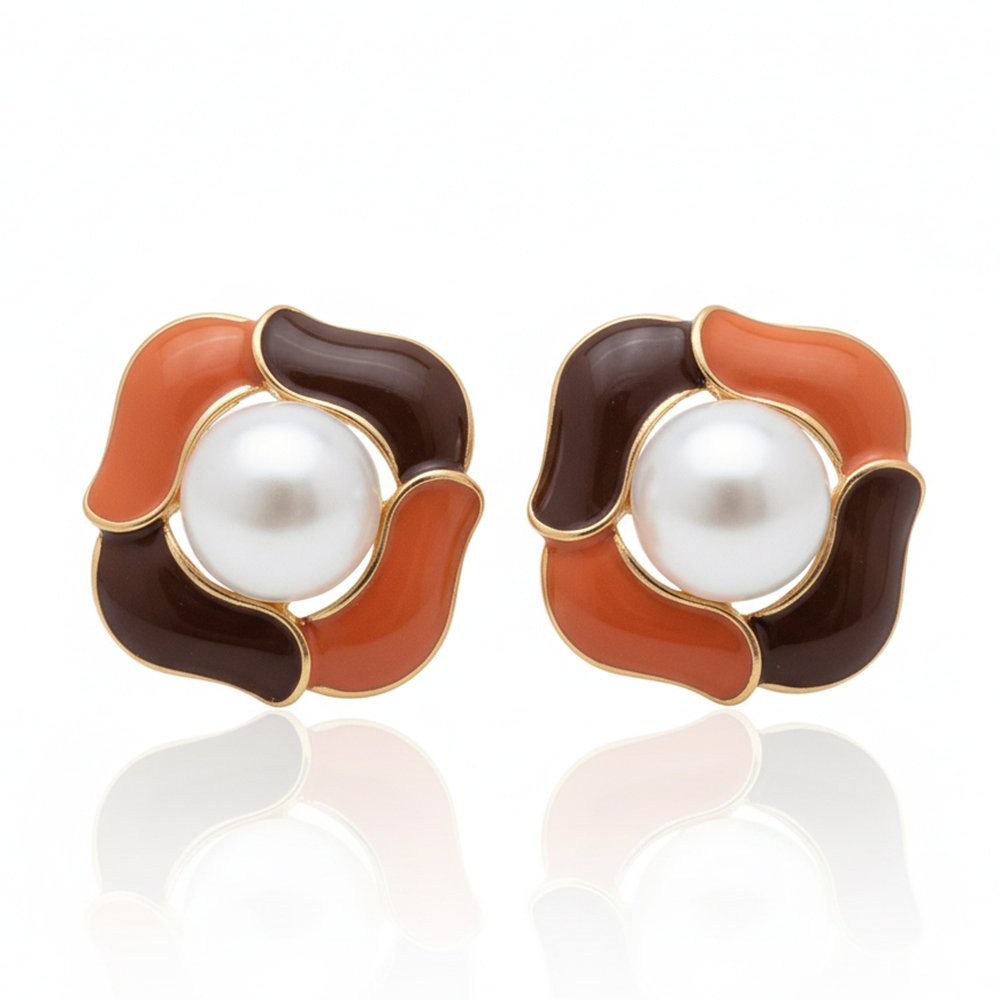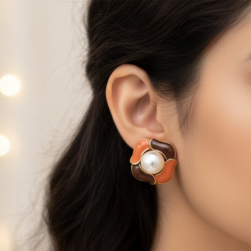 Infuse a touch of chic, abstract style into your daily wardrobe with these striking Earthy Tone Enamel Studs. This unique, rounded floral design features smooth, glossy enamel in rich Terracotta Orange and deep Chocolate Brown. Centered with a luminous Faux Pearl, these studs offer a modern, warm, and utterly sophisticated look.