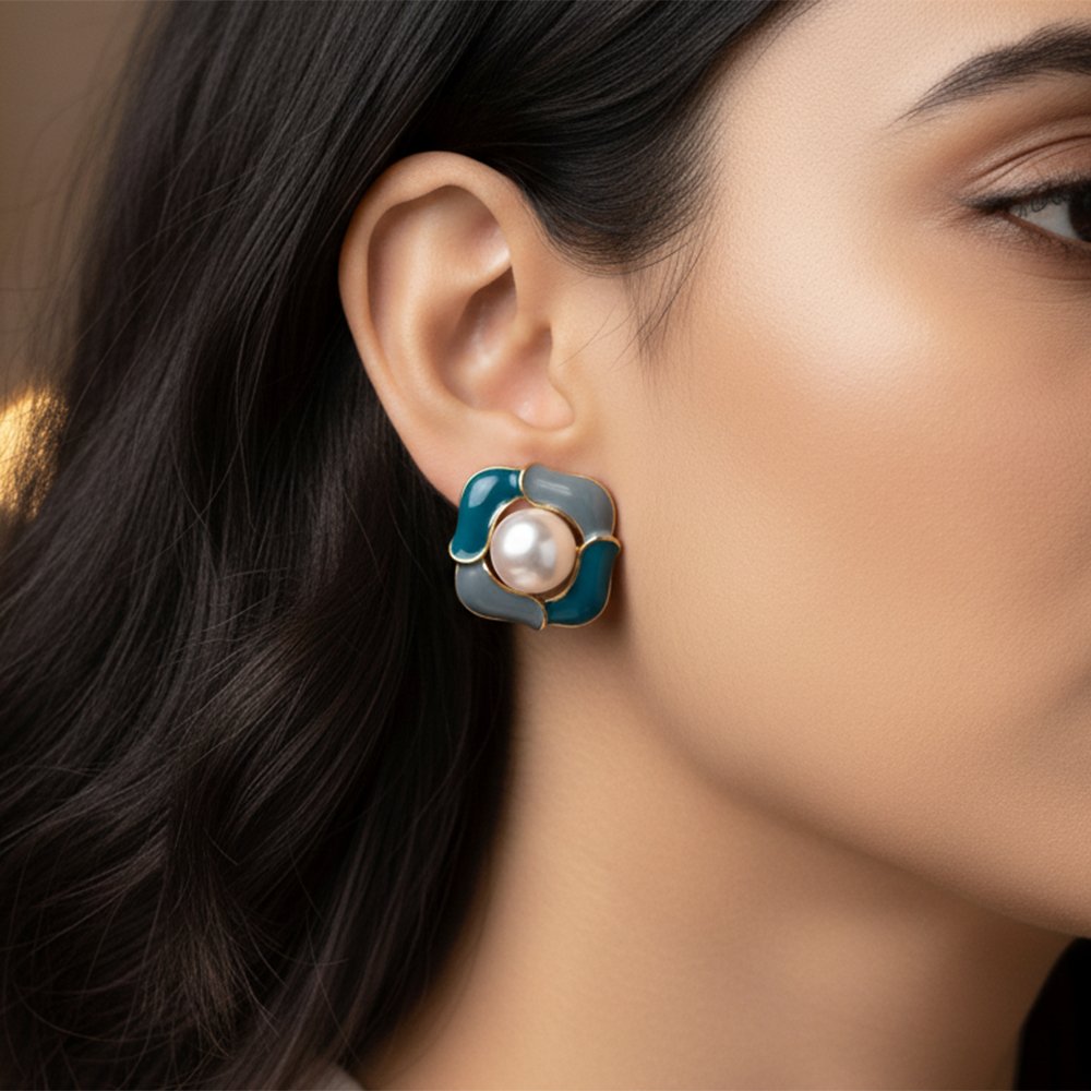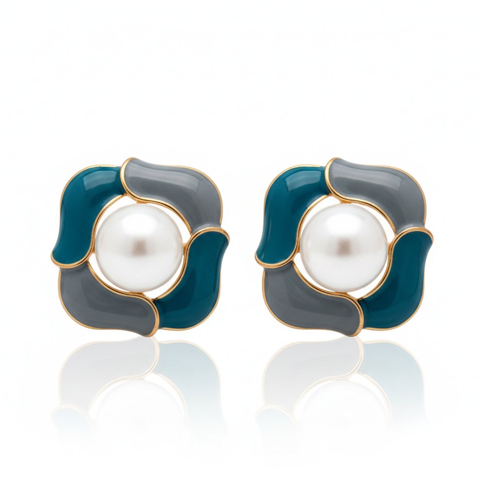 Elevate your contemporary style with these effortlessly chic Urban Chic Enamel Studs. This striking abstract design features glossy enamel in the sophisticated contrast of Deep Teal and elegant Slate Grey. Centered with a luminous Faux Pearl, these studs offer a modern, polished, and perfectly balanced look ideal for daily elegance and professional settings.