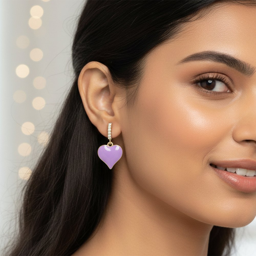 Drift into delicate style with these charming Lavender Dream Heart Drop Earrings. The smooth, glossy Lilac/Lavender enamel heart dangles gracefully from a dainty, CZ-studded gold hoop, offering a perfect blend of subtle colour and sweet romance. These are the ideal lightweight accessory for a fresh, fashionable, all-day look.