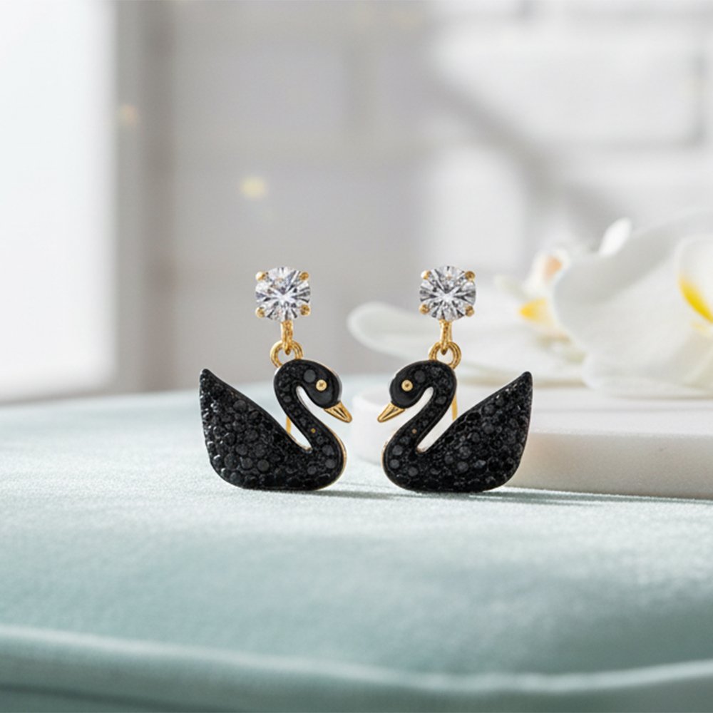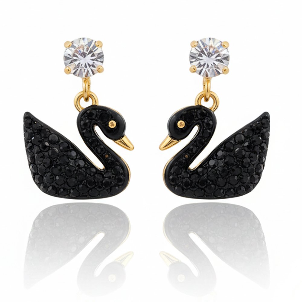 Design: Classic Swan silhouette filled with tiny black stones, suspended from a brilliant clear Solitaire CZ stud.