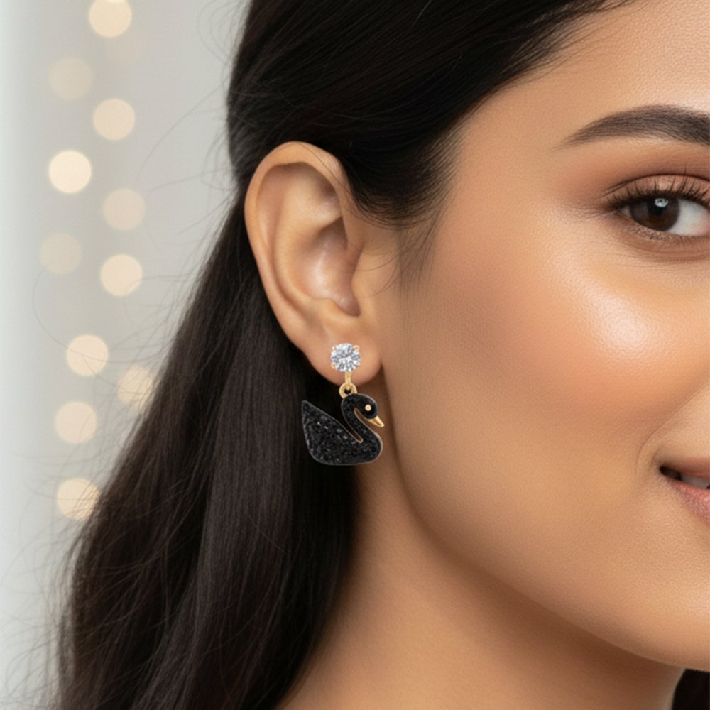 Make a graceful and sophisticated statement with the enchanting Black Swan Drop Earrings. The majestic swan silhouette is beautifully outlined in gold and filled with brilliant micro-pavé black CZ stones, hanging from a single, dazzling CZ solitaire stud. These earrings are the perfect blend of elegance and modern charm, adding a touch of luxury to any outfit.